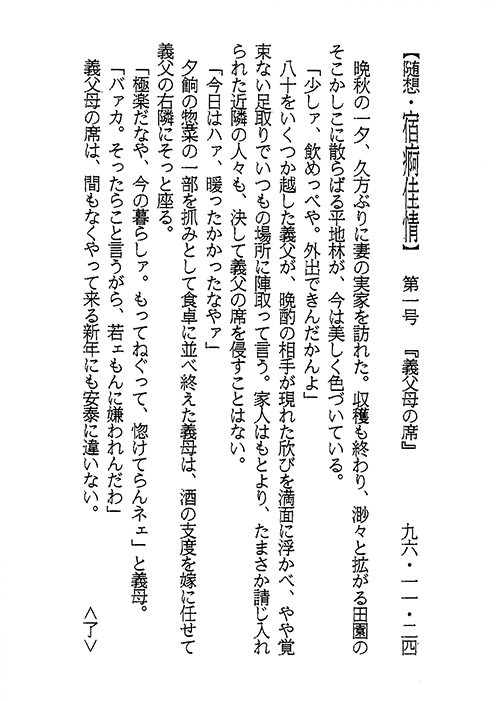 「随想・宿痾佳情」は野添嘉久氏の個人的な思索や日常生活の観察、そして自身の病気との闘病経験を織り交ぜながら、彼が長年深く関わってきた社会問題や歴史認識について綴ったエッセイです。