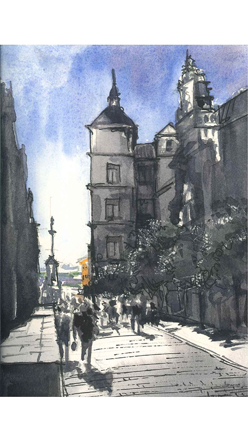 「高校で建築を始めた時に、絵が描けないとだめだと兄に言われて美術部に入ったのが描くきっかけです。最初は油絵だったから時間がかかった。しかし、水彩は、30分くらいで描けますから、旅先でのスケッチがおもしろい。事務所を独立してからは年に一回は海外に出かけるようにしています。旅先の風景を絵に残すのと写真だけに残すのは違います。絵は長い時間見ていられる。風景は見ているようで見ていないし忘れちゃう。30分なり1時間なり、スケッチするためにそこにいると、気が付かなかったものが見える。いろんなものを見始める。そうすると忘れないですね」