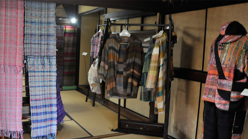 「このドレスは去年より前かなぁ、のろぼっけに先生が来てくださり一緒に織りました」と、機織機の前で織り方を説明してくれた。