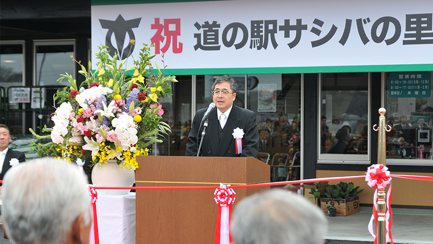 「道の駅サシバの里いちかい」のオープンで挨拶する入野町長(2014年4月20日)