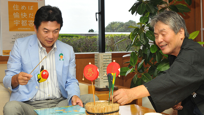 宇都宮の民芸品「黄ぶな」をもつ佐藤市長